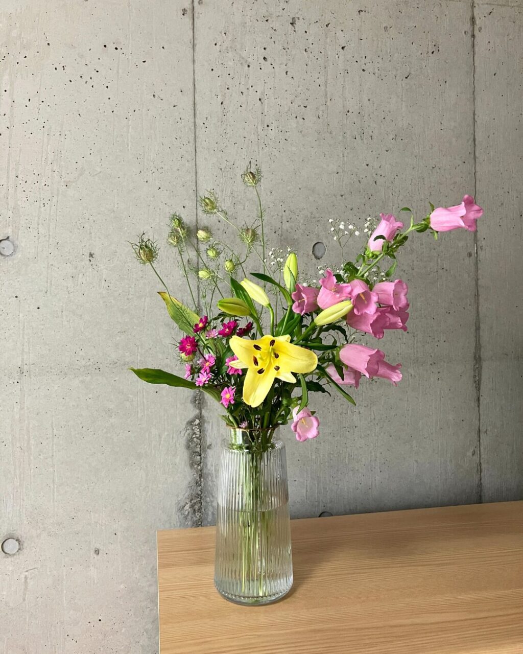 ユリを中心としてピンク系でまとめられつつも、グリーンや少しの黄色味が空間と色に広がりを持たせてくれています。