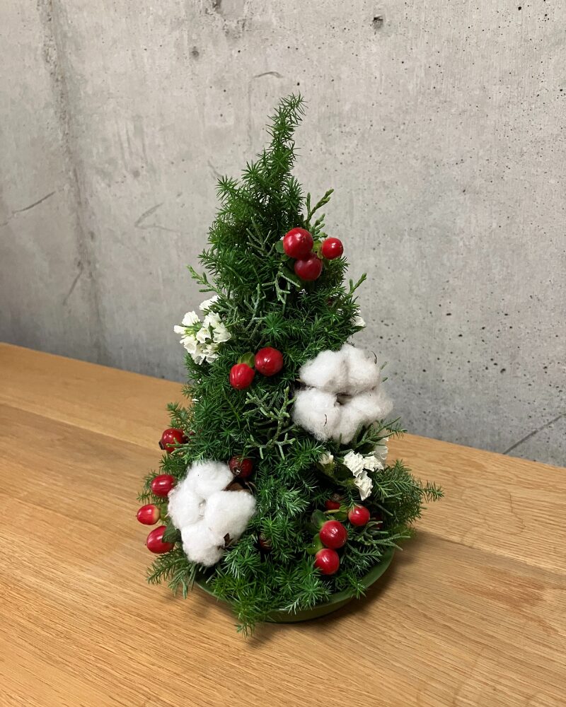 赤い実やコットンが入った王道ツリーなのですが、生の木を使っているからか、実際とてもおしゃれです。