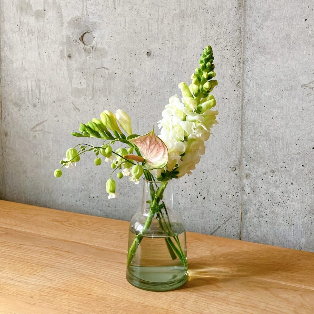 スナップ、フリージア、アンスリウム、シレネはホワイト&グリーンでまとめてガラス花瓶に。