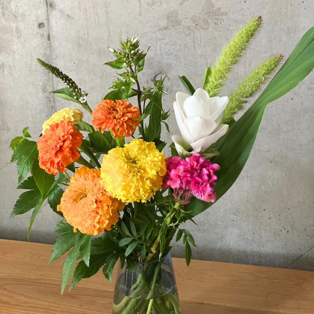 花サブスクのLIFFTから実際に届いたお花。黄、オレンジのマリーゴールドなど