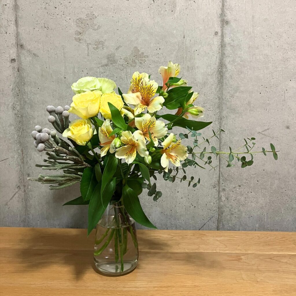 青山フラワーマーケットのサブスクで実際に届いたお花。黄いろいバラ、白黄緑のトルコギキョウ、アウストリメリアなど